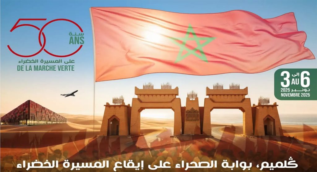 في إطار الاحتفالات الوطنية المخلدة للذكرى الخمسين للمسيرة الخضراء المظفرة، نظمت ولاية جهة كلميم واد نون ووكالة تنمية الأقاليم الجنوبية، بشراكة مع مجلس جهة كلميم واد نون والمجلس الجماعي لكلميم ووزارة الشباب والثقافة والتواصل ووزارة التربية الوطنية والتعليم الأولي والرياضة، خلال الفترة الممتدة من 2 إلى 6 نونبر 2025، برنامجا احتفاليا تحت شعار: “كلميم.. بوابة الصحراء على إيقاع المسيرة الخضراء”.