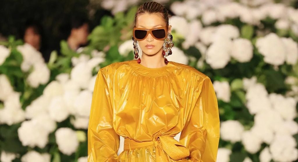 تألقت بيلا حديد في عرض دار سان لوران الذي أقيم يوم 29 شتنبر 2025 في حديقة خلابة عند ساحة تروكاديرو، مع برج إيفل الشهير كخلفية للحدث. سارت على المنصة بخطوات واثقة مرتدية معطف ترنش شفافا باللون الأصفر اللامع (الماريغولد)، بأكتاف بارزة وحزام يبرز خصرها. أكملت إطلالتها بأقراط ضخمة، ونظارات شمسية كبيرة، وكعب عالٍ حاد، في look متكامل جعلها بطلة العرض بلا منازع.