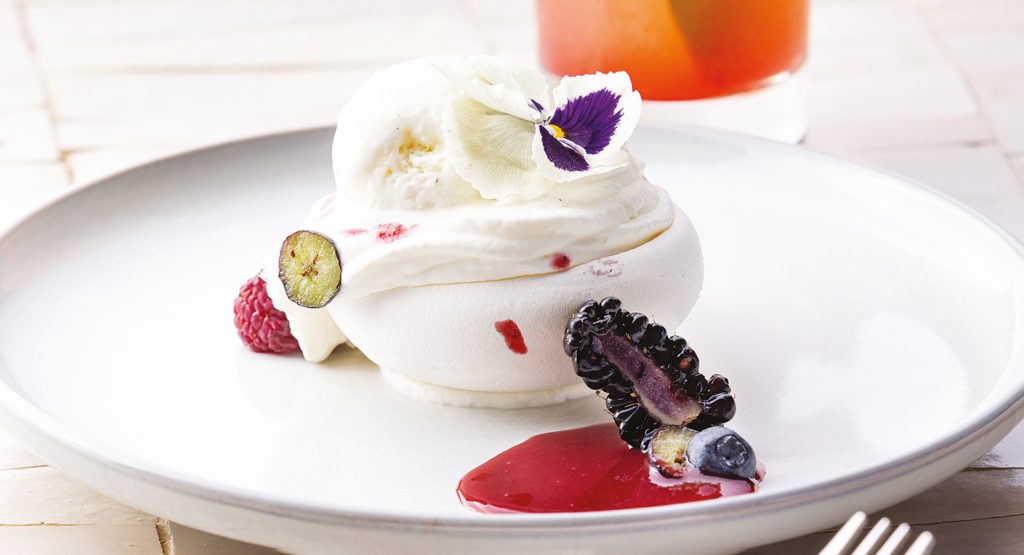تحلية خفيفة تجمع بين هشاشة المورانغ وحلاوة الفواكه الموسمية، من إعداد الشيف محمد أباراغ بمطعم في فندق سوفيتيل الدار البيضاء.