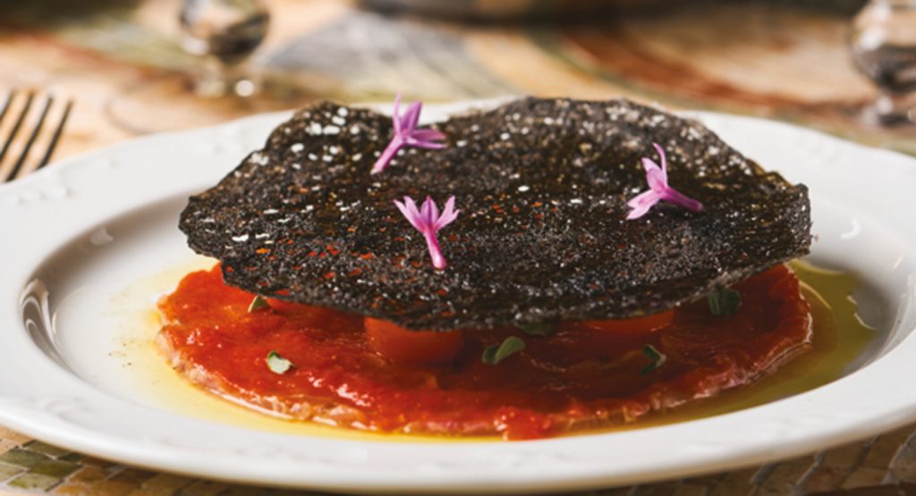 تغطى شرائح التونة بصلصة الطماطم، تضاف إليها قشرة حامض مبشورة، ثم الطماطم الصغيرة، وفوقها التوييل الأسود. تزين بملح البحر، زيت زيتون، الزهور وأوراق المرددوش.