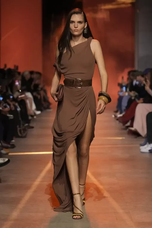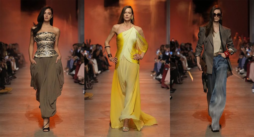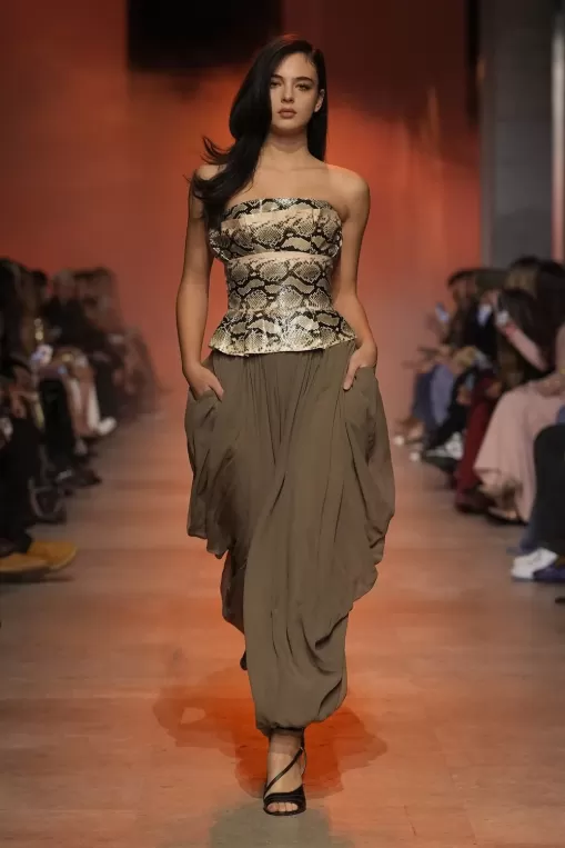 تميّز العرض بتصاميم تجمع بين الانسيابية والبنية القوية، حيث حضرت الفساتين المتدفقة بخطوطها الشفافة وأقمشتها الخفيفة التي تنساب على الجسد برقة، إلى جانب المعاطف المهيكلة التي أضافت طابعا عمليا وأناقة فاخرة. هذه الثنائية بين الرقة والقوة منحت الإطلالات حضورا متجددا يعكس صورة المرأة الحديثة التي تجمع بين الحس الجمالي والثقة.