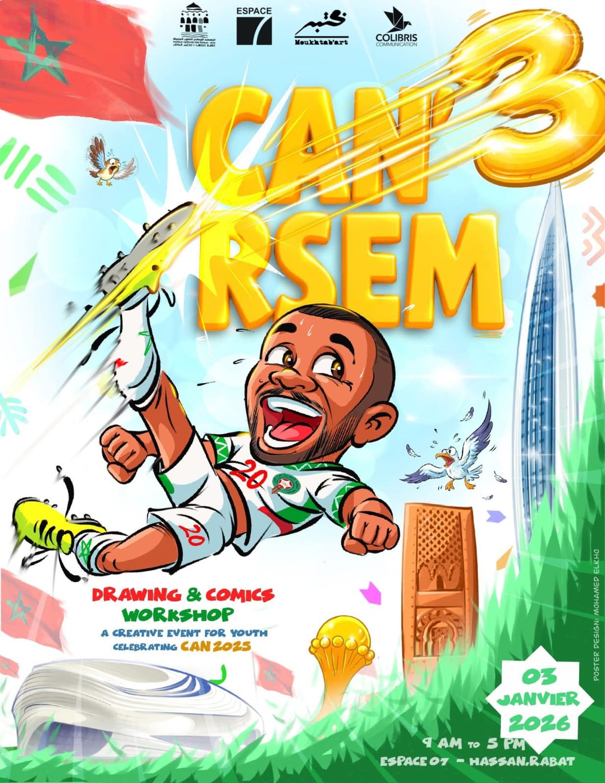 في دورتها الثالثة، إذ اختار منظمو الفعالية في ربط الحدث الفني بالحدث الكروي القاري في توليفة ألهمت المشاركين ووثقت لأجواء الكان بمختلف أشكال التعبير الفني: رسم نحث، إبداع رقمي، قصص مصورة .. أجواء من المنافسة محورها عوالم الكان المغربي ورموزه ممثلا في منتخبنا ومجسدا في “السبع”.
